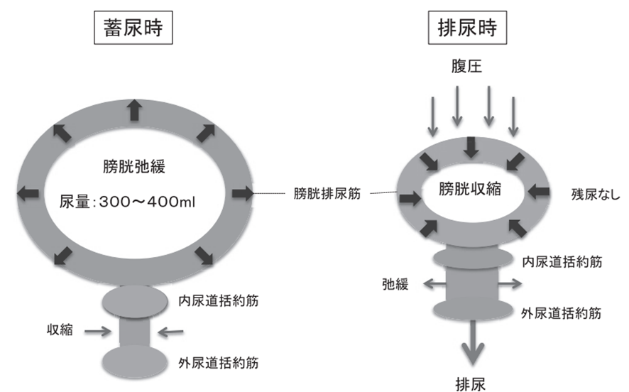 排尿のメカニズムは下記の通りである。蓄尿時は、膀胱排尿筋が弛緩し、内尿道括約筋は収縮している。これにより、約300〜400mLの尿を蓄える事ができる。排尿時は、膀胱排尿筋が収縮し、内尿道括約筋は弛緩する。本症例は、処方内容から神経因性膀胱による排尿困難と想定され、膀胱排尿筋の収縮力が低下していると考えられる。
