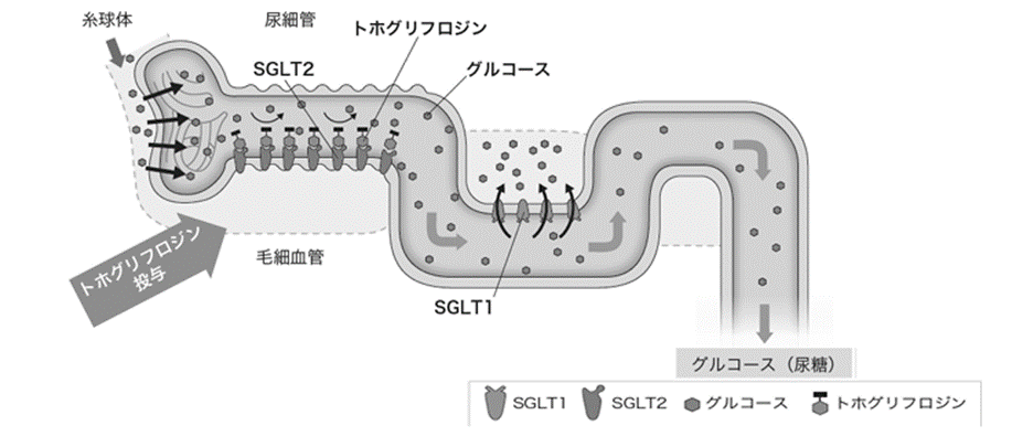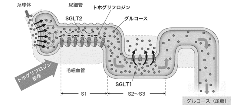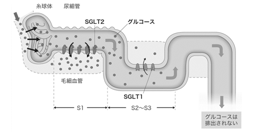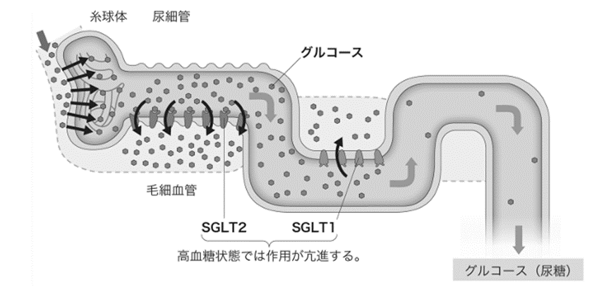 原尿に含まれる大部分(約90%)のグルコースは、近位尿細管S1分節の管腔側に発現していSGLT2 により再吸収され、残りのグルコースは遠位側のS2/S3分節に発現しているSGLT1で再吸収される。 通常、食後に血糖が上昇してもグルコースは、主に SGLT2 の作用により尿中に排泄されない。
