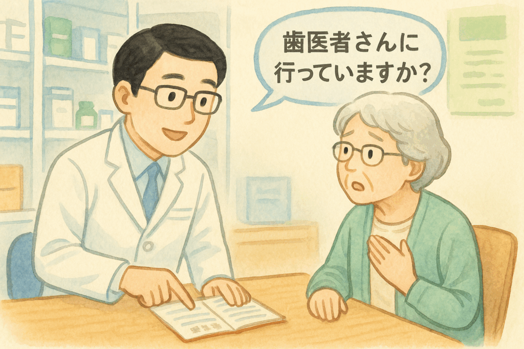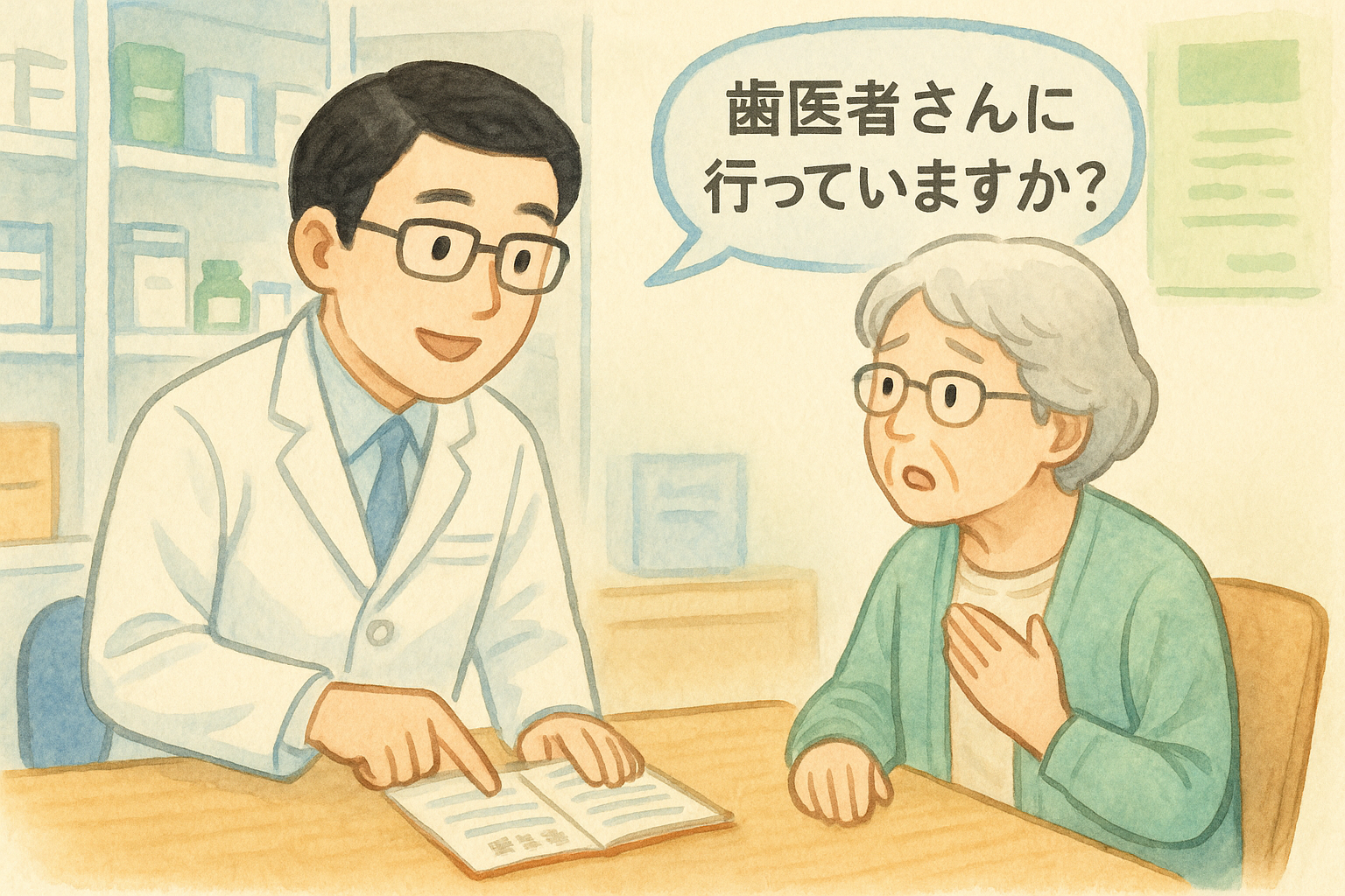 70代女性。高血圧、糖尿病で治療中。検診で骨密度低下を指摘され、整形外科を受診した。骨粗鬆症と診断され、本日より週1回のビスホスホネート(BP)製剤が開始となった。歯科治療について定期的な受診は行っていないが、最近痛みのある部分があり、近日中に行くつもりだったので処方医には歯科治療を受けていると伝えたとのこと。