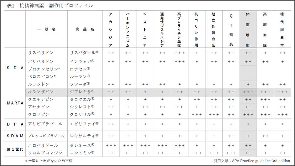 抗精神病薬の中でも、オランザピンは体重増加や代謝異常のリスクが高いことが知られています(表1)。これは食欲亢進や糖・脂質代謝への影響を介して、短期間で顕著な体重増加を引き起こす場合があるためです。そのため、体重増加に強い不安を抱く患者に対しては、代替薬の検討が臨床上重要となります。一方、アリピプラゾールおよびブレクスピプラゾールは、いずれもドパミンD₂受容体部分作動薬(partial agonist)として作用する薬剤であり、従来の抗精神病薬に比べて体重増加や代謝異常のリスクが比較的少ないとされています(3)。さらに、セロトニン受容体への作用も併せ持つことで、抗精神病効果を維持しつつ副作用プロファイルを改善している点が特徴です。そのため、体重増加に強い不安を抱く患者に対しては、アリピプラゾールやブレクスピプラゾールが代替薬として適切な選択肢となり得ます。ただし、切り替えの際にはリバウンドアカシジアなどの錐体外路症状(EPS)の発現や統合失調症の病態悪化を防ぐため、上乗せ漸減法など慎重な方法で行うことが望まれます。